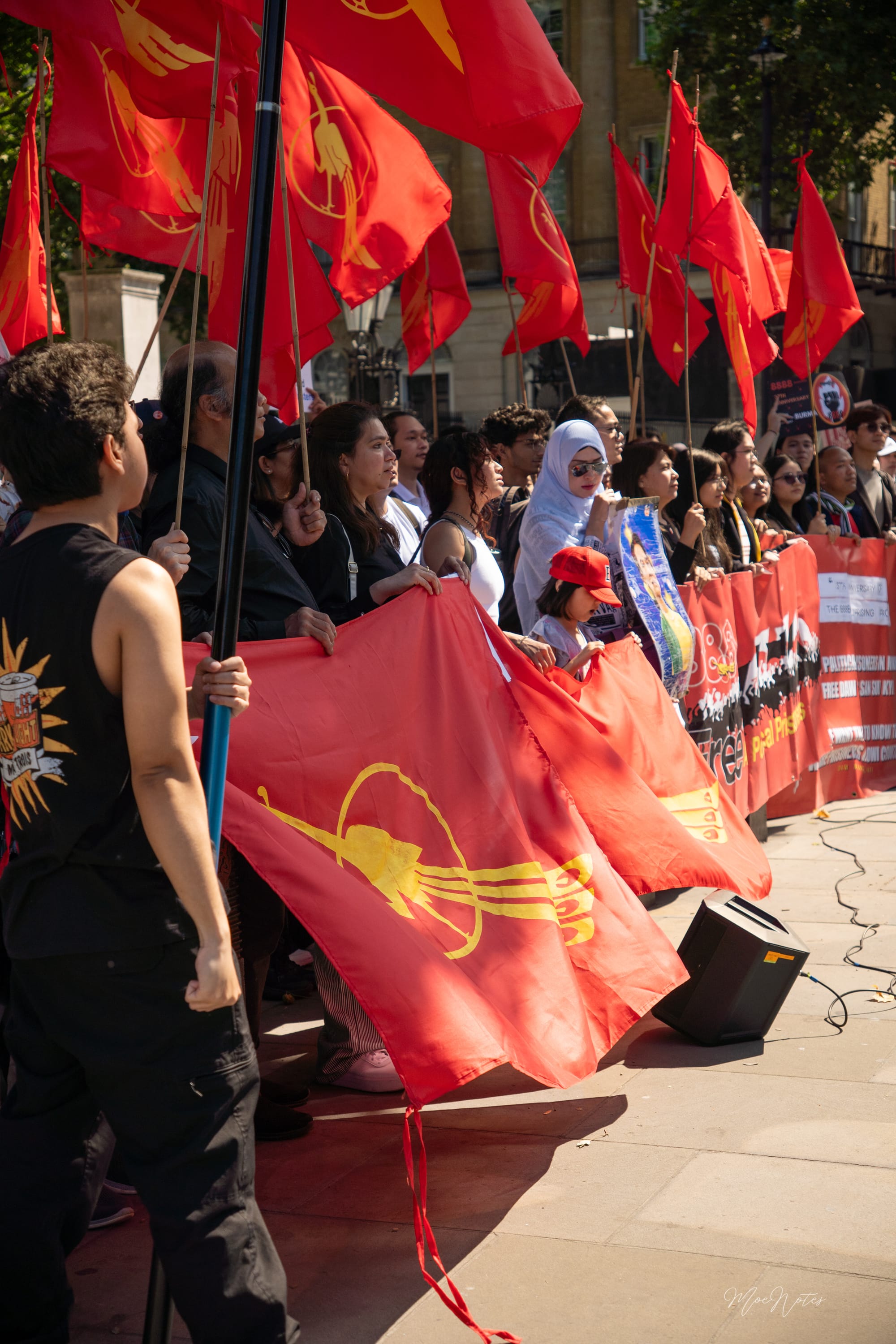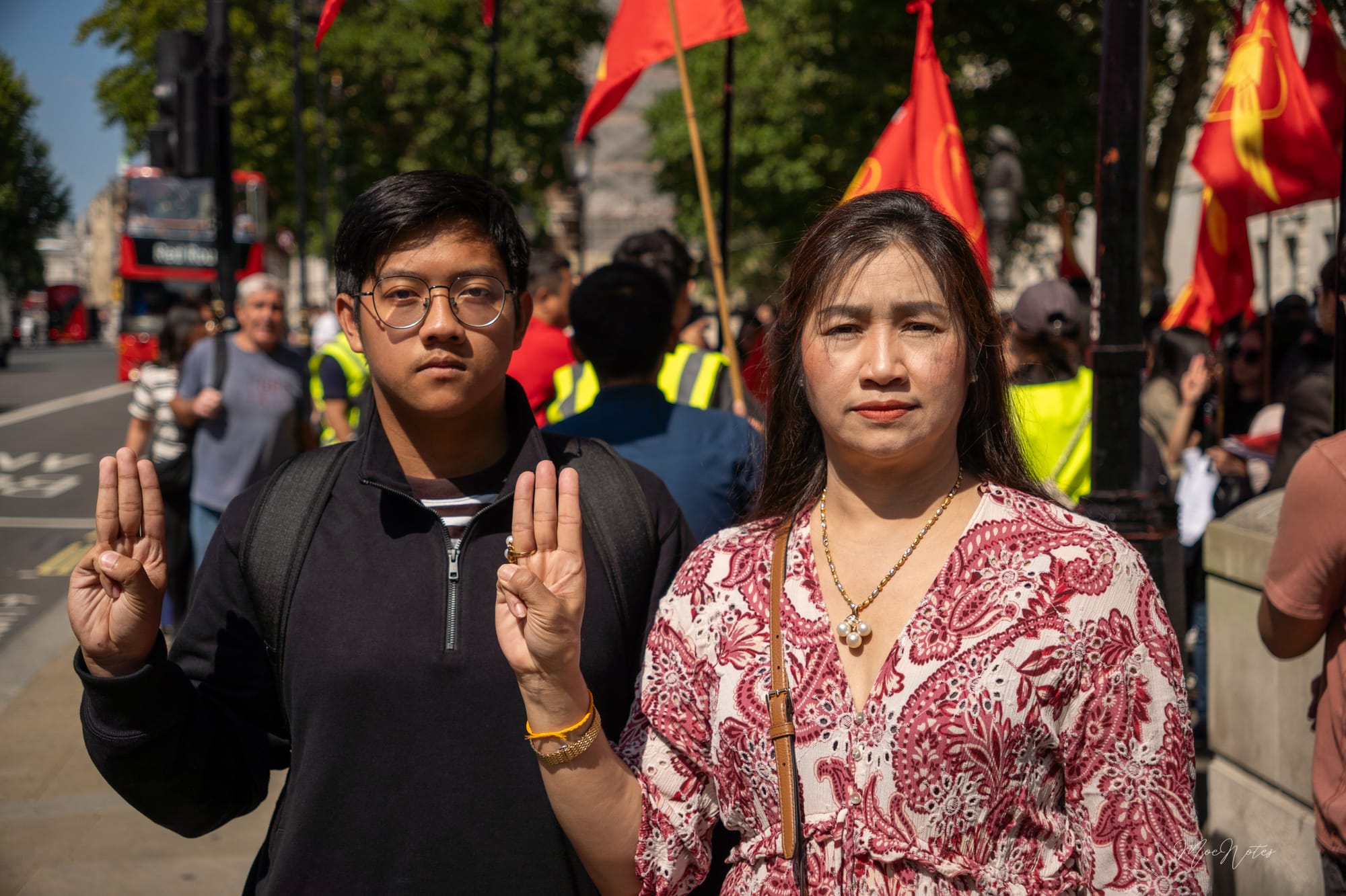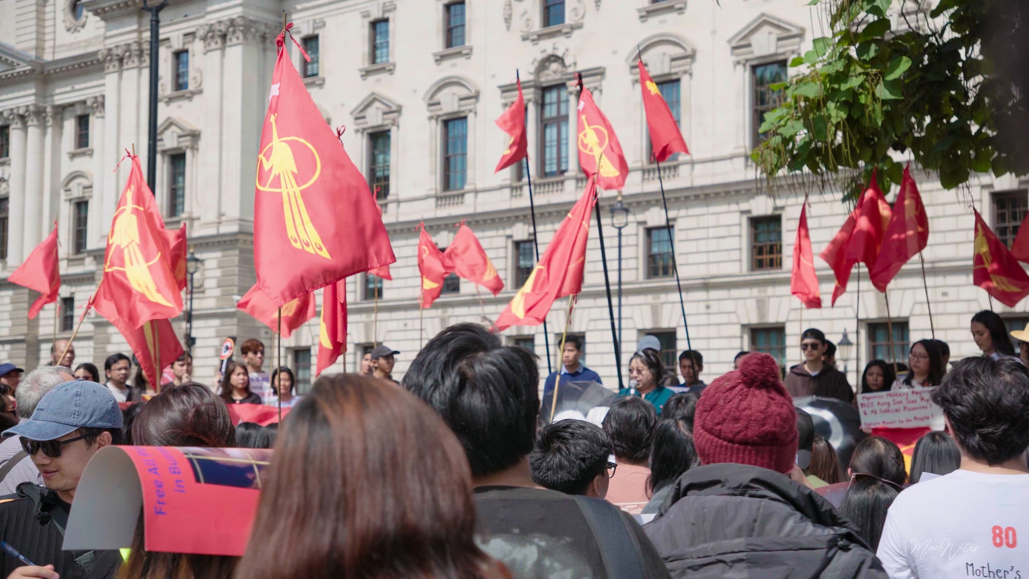 လန်ဒန်မြို့လယ်က Parliament Square မှာ အနီရောင်ဒေါင်းအလံတွေလွင့်ပျံတဲ့နေ့။ ဗီဒီယို/ဓာတ်ပုံဆရာတစ်ဦးအနေနဲ့ ကျနော့်အလုပ်က မှတ်တမ်းတင်ရုံပါ၊ သို့သော်ကျနော် မျက်နှာတွေကို မြင်နေရတယ်။