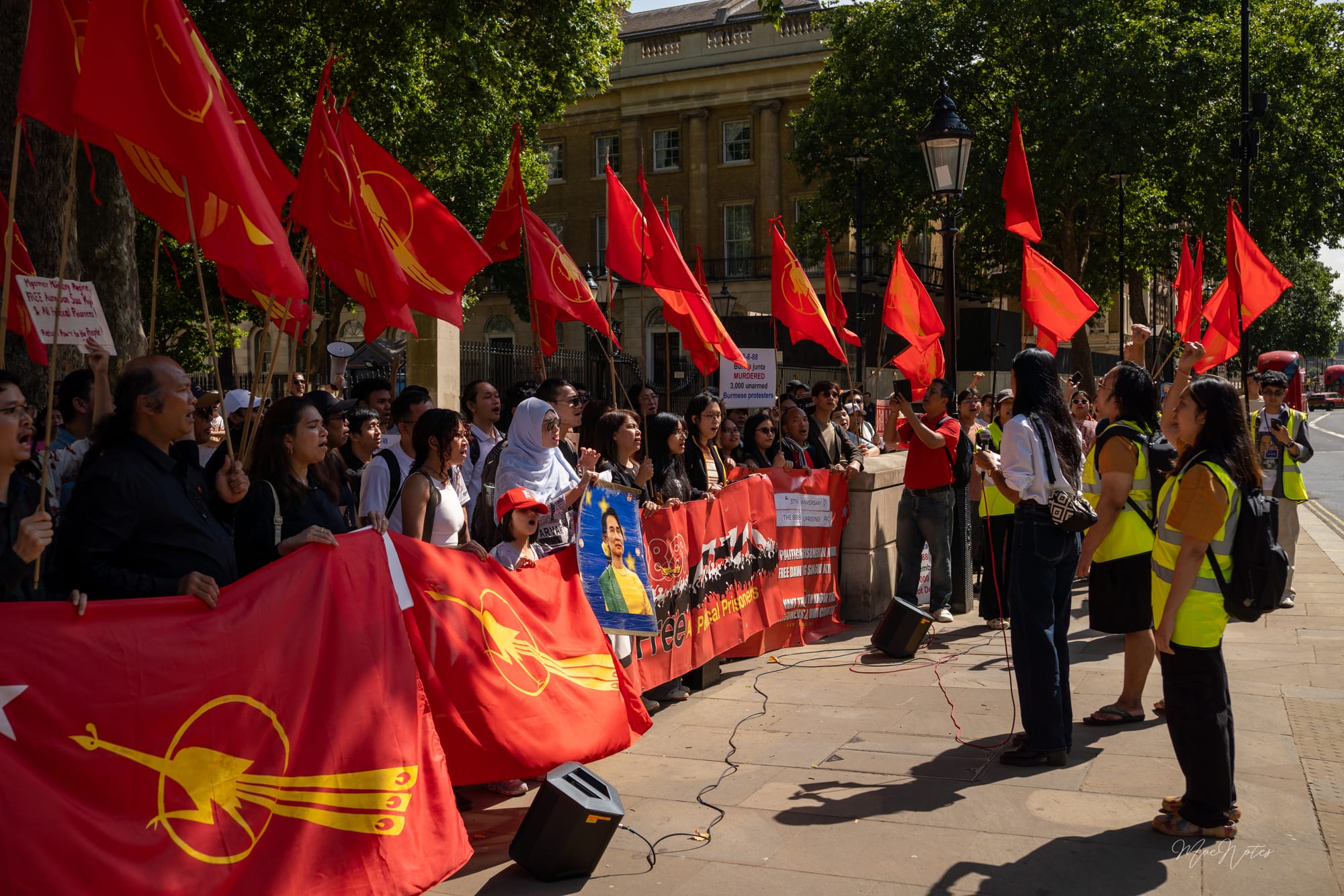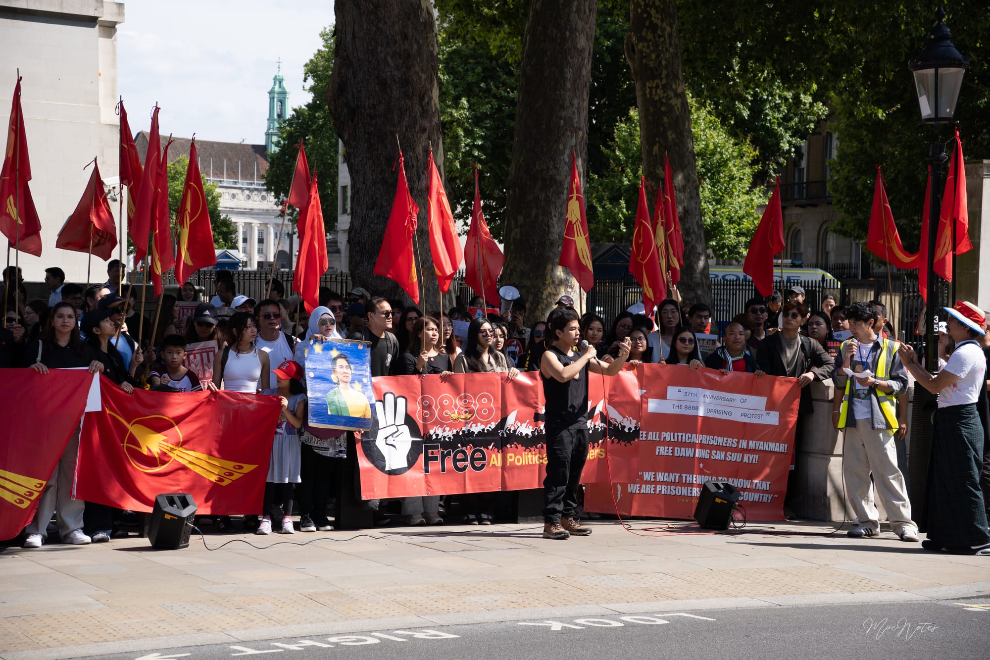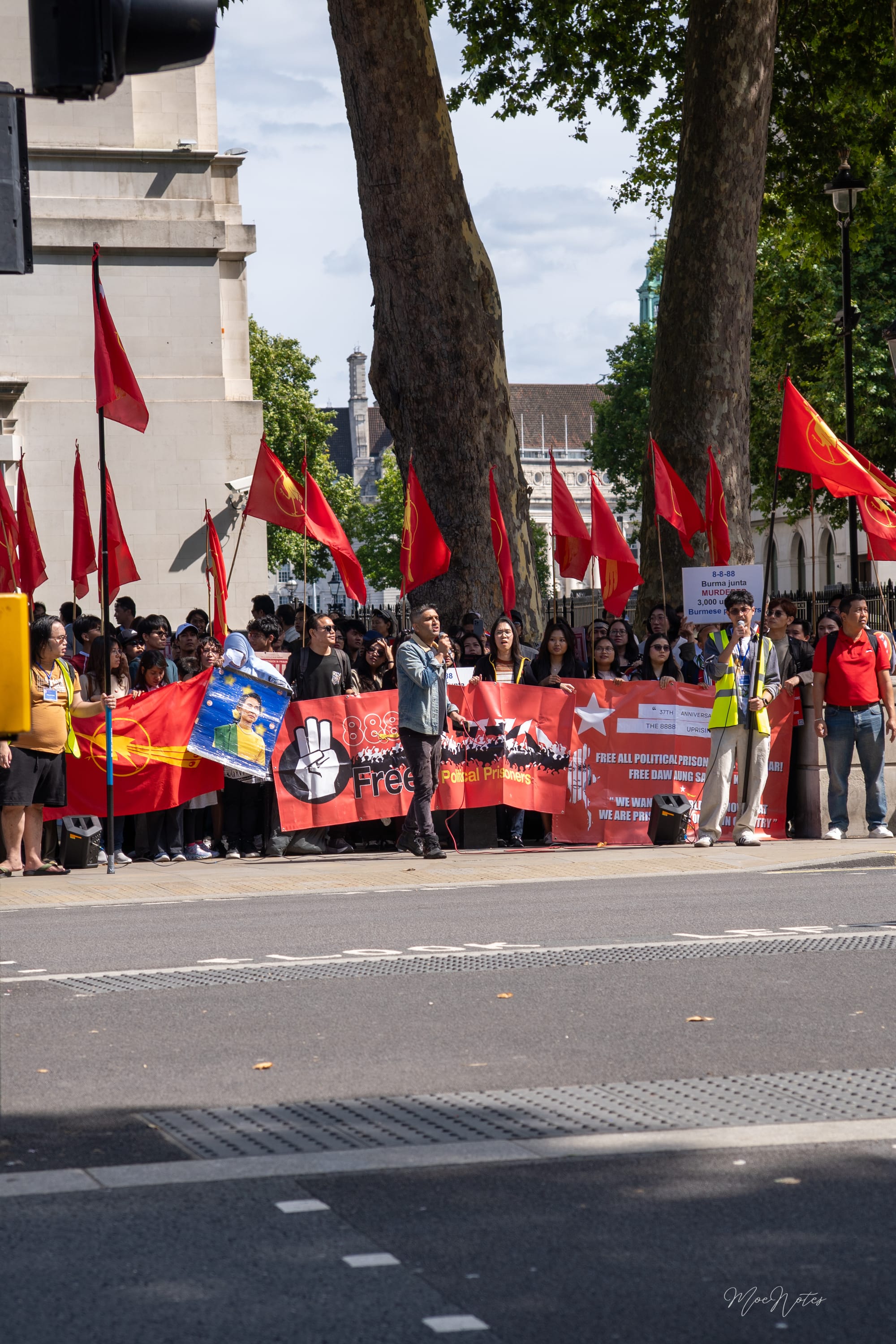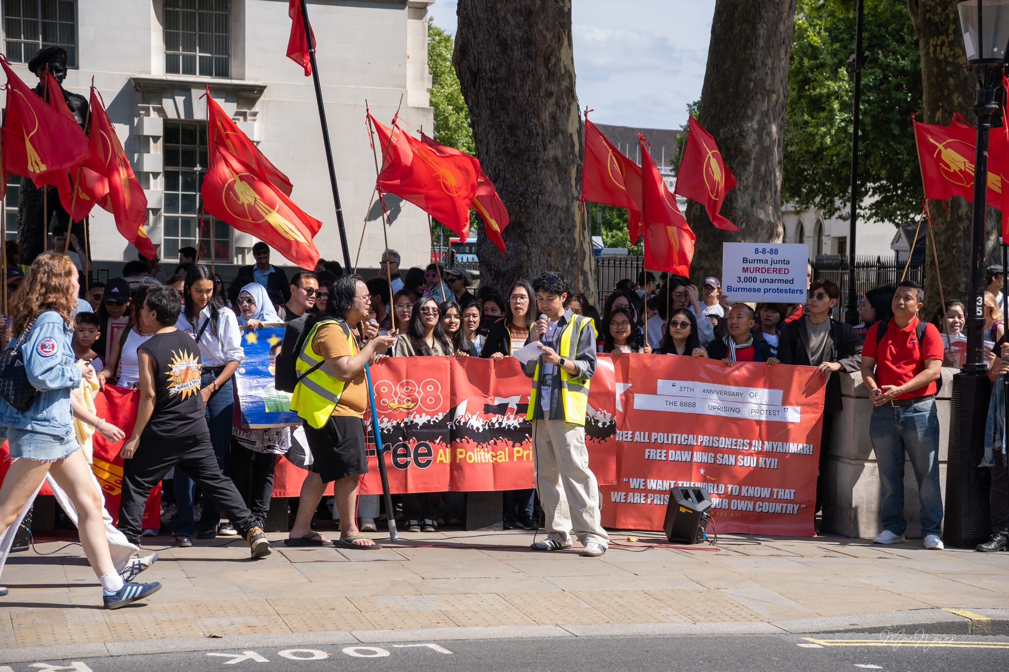 8/8/2025. A day the red peacock flags flew in Parliament Square, central London. As a videographer/photographer, my job is simply to document, but what I see are the faces. The faces of the elders, the veterans, attending on behalf of the comrades who gave their lives in '88, in past freedom struggles, and now in the Spring Revolution. And then, the faces of the new Spring Revolution generation, who are trying to end this fight.