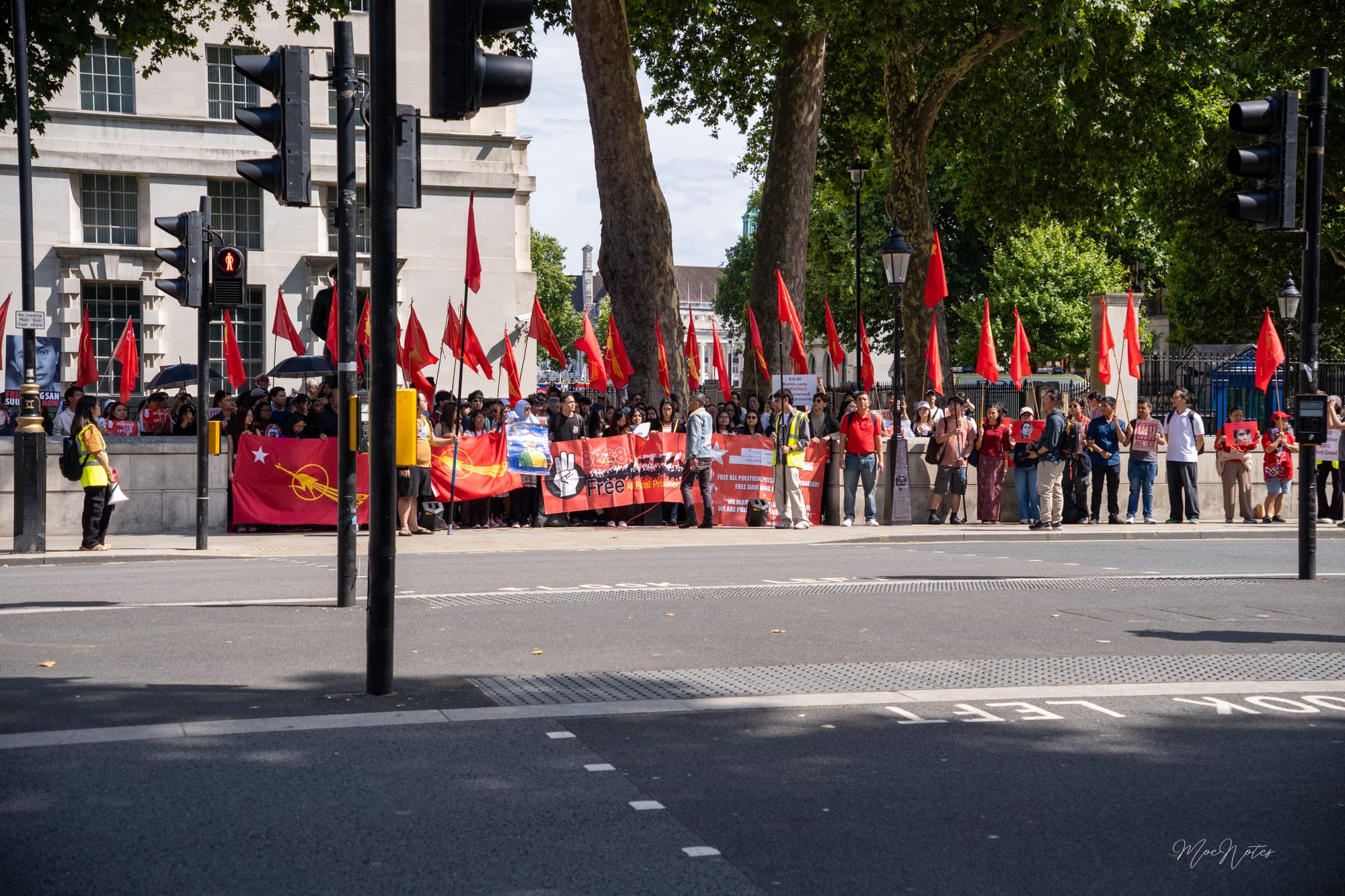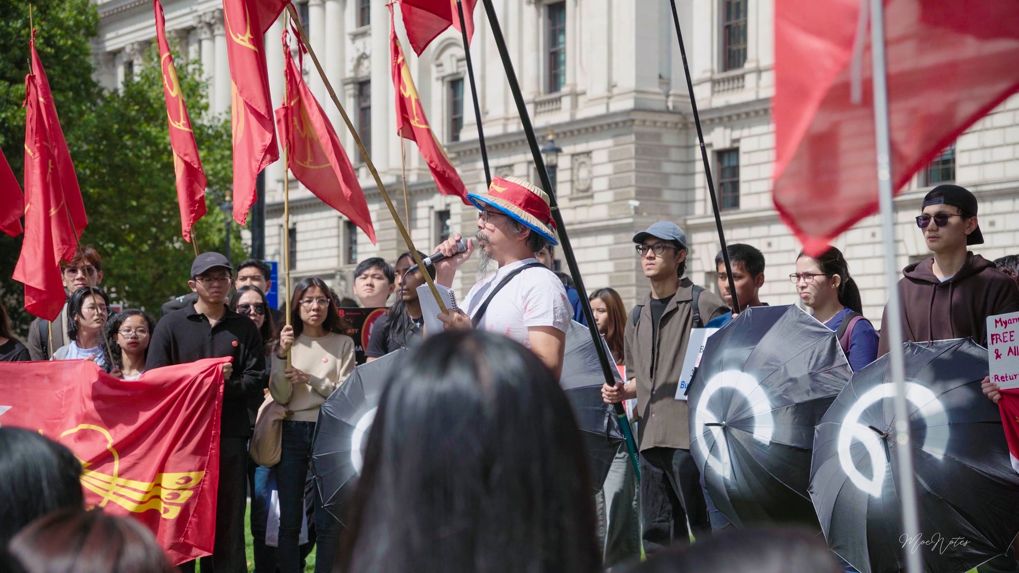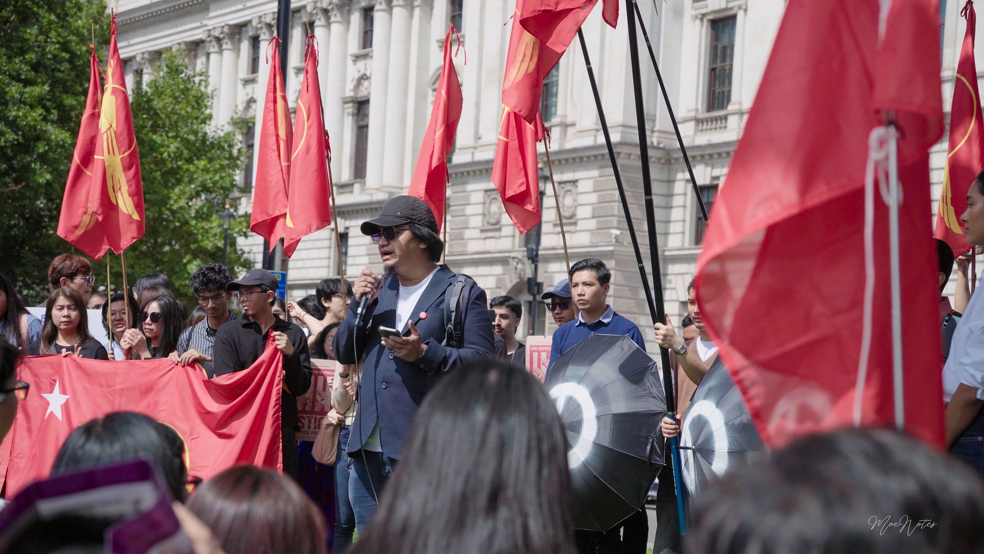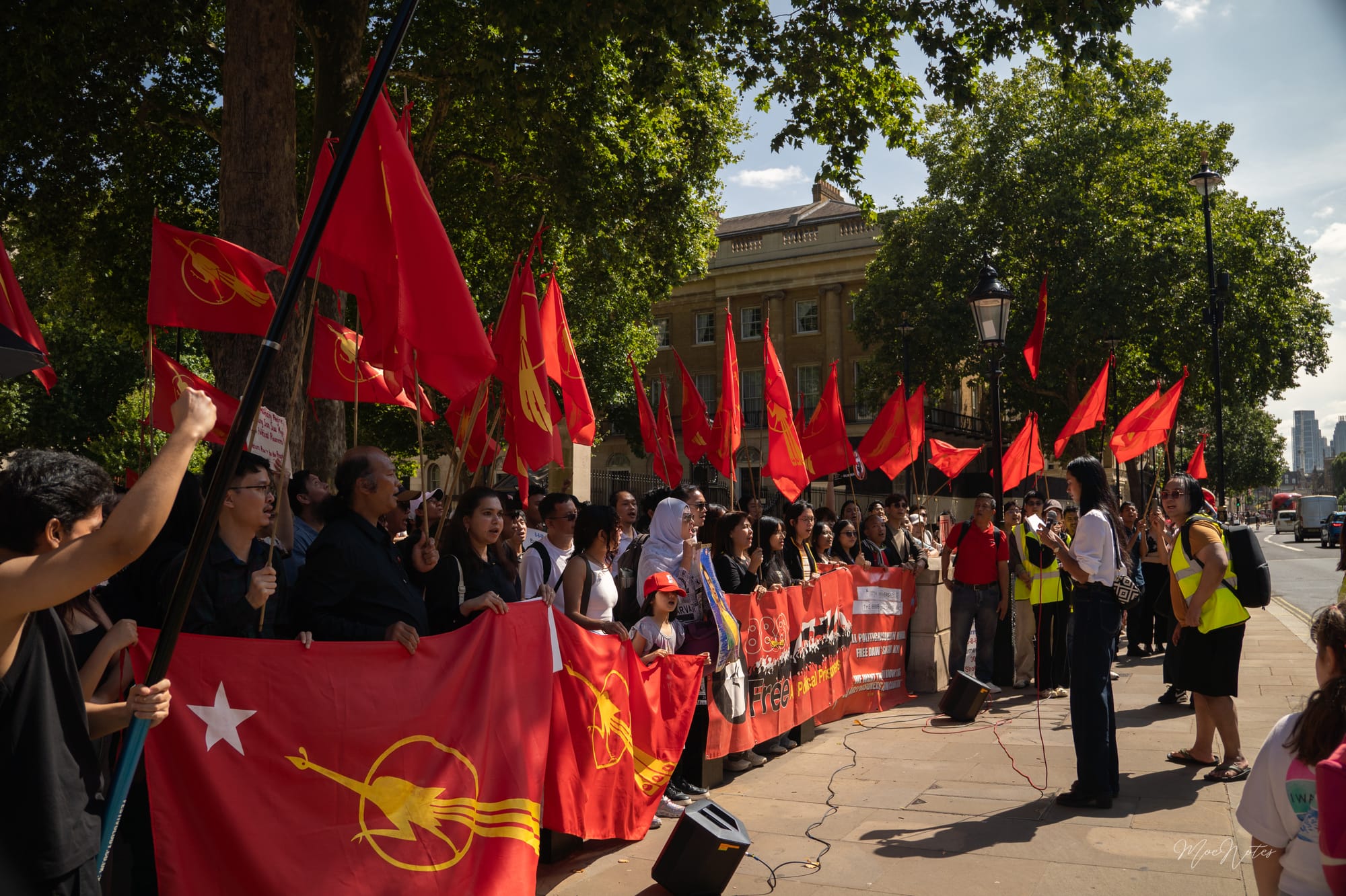 8/8/2025. A day the red peacock flags flew in Parliament Square, central London. As a videographer/photographer, my job is simply to document, but what I see are the faces. The faces of the elders, the veterans, attending on behalf of the comrades who gave their lives in '88, in past freedom struggles, and now in the Spring Revolution. And then, the faces of the new Spring Revolution generation, who are trying to end this fight.