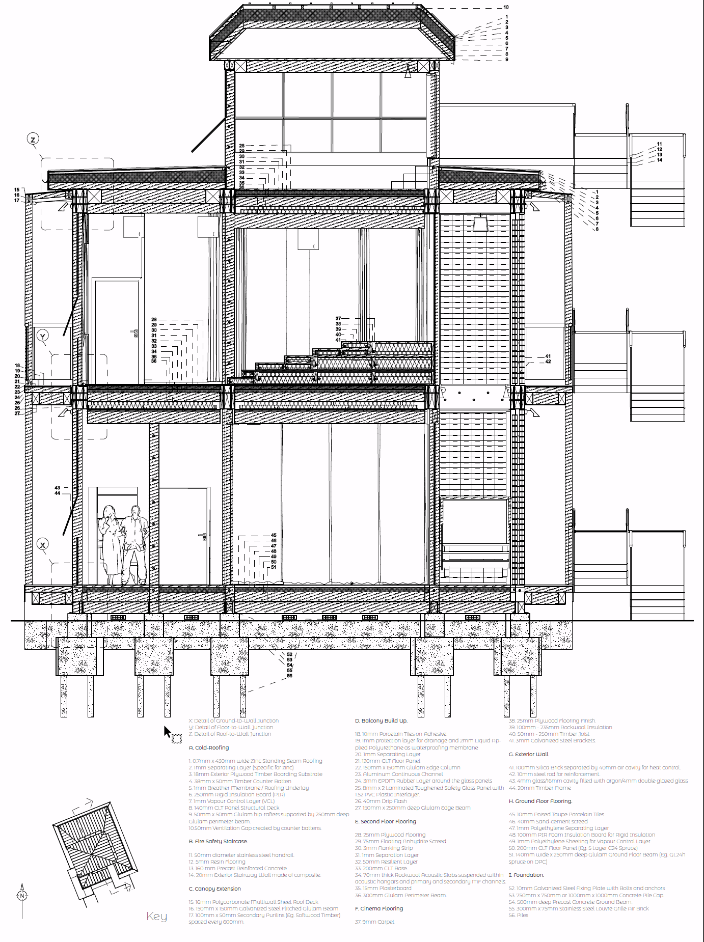 ရိုးရှင်းတဲ့ပစ္စည်းများကို အသုံးပြုထားပါတယ်။ timber frame သည် အဓိကဖွဲ့စည်းပုံကို ပံ့ပိုးပေးပြီး၊ သင်္ဘောကျင်း၏ စက်မှုအမွေအနှစ်ကို ရည်ညွှန်းပါတယ်။ (Silica Brick) ဖန်အုတ်များကဲ့သို့သော ခေတ်မီပစ္စည်းများနှင့် ပေါင်းစပ်ထားပါတယ်။ ညဘက်အမြင်အာရုံကို ဆွဲဆောင်နိုင်တယ်၊ အဆောက်အဦးကိုလဲ အလင်းစိမ့်ဝင်စေနိုင်တယ်။ acoustic flooring systems တွေလဲထည့်သွင်းထားပါတယ်။ ရုပ်ရှင်ထုတ်လုပ်ရေးရဲ့ များပြားလှတဲ့ လိုအပ်ချက်တွေကို ပြည့်မီစေရန် နည်းပညာပိုင်းဆိုင်ရာ စွမ်းဆောင်ရည်ကောင်းမွန်စေရန်အတွက် ဒီဇိုင်းထုတ်ထားပါသည်။