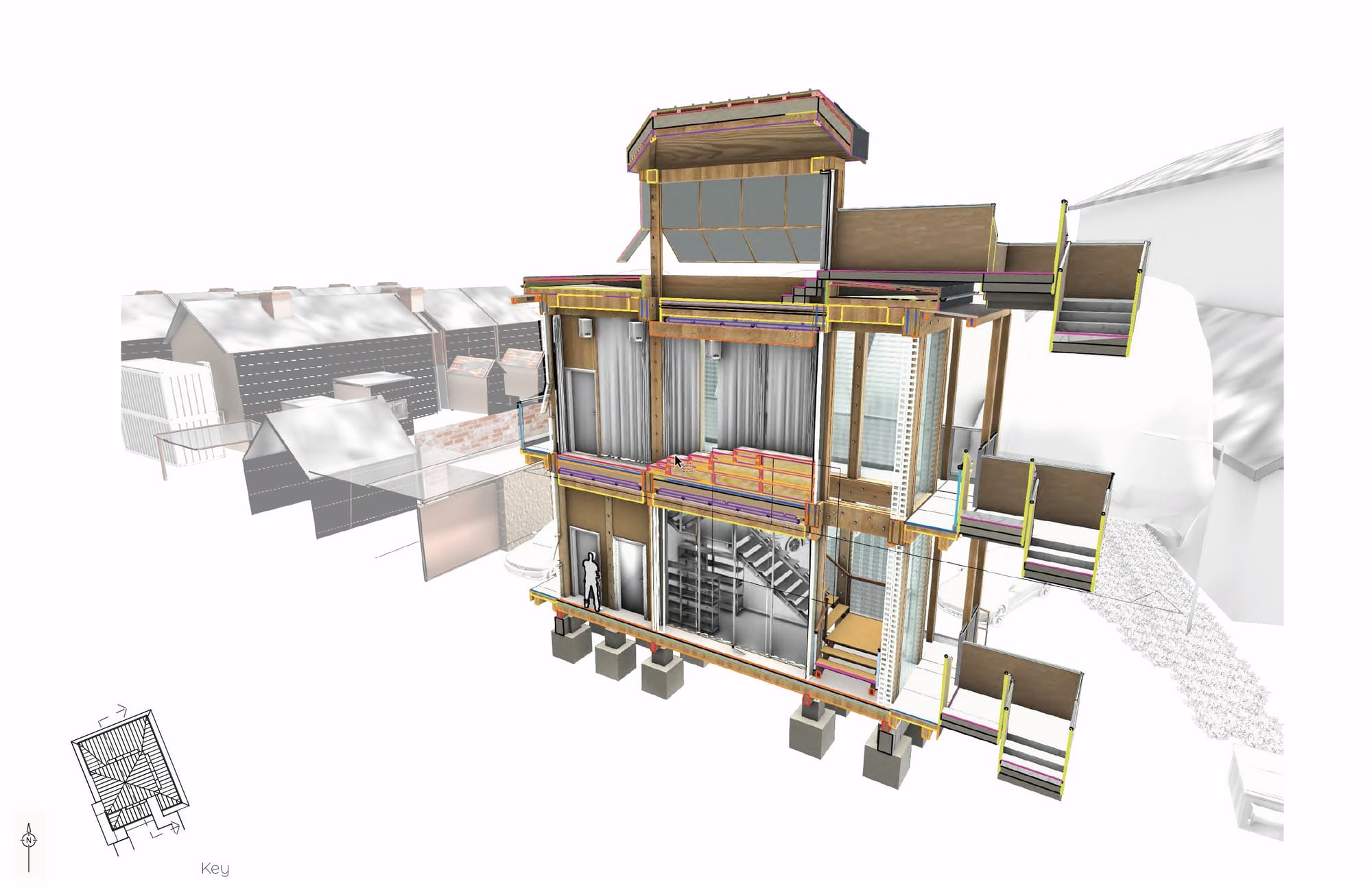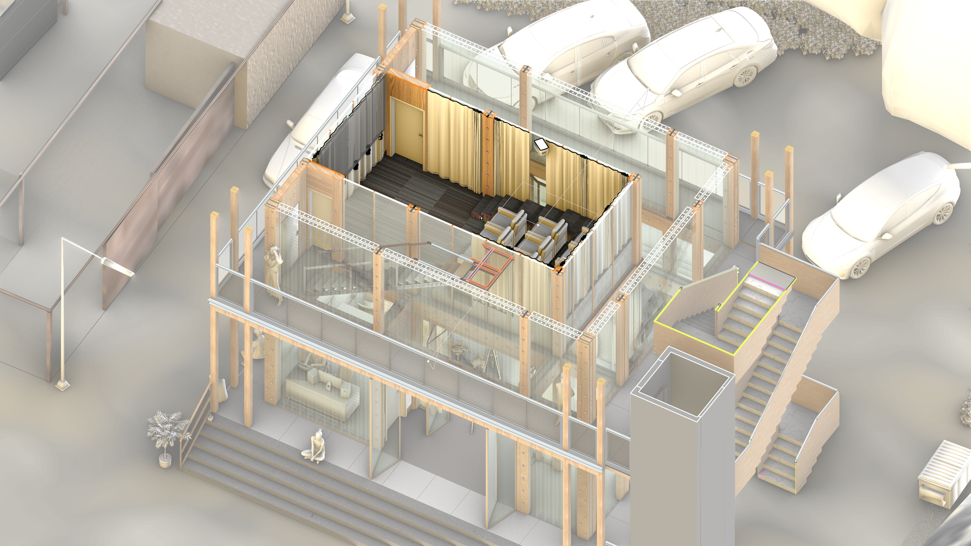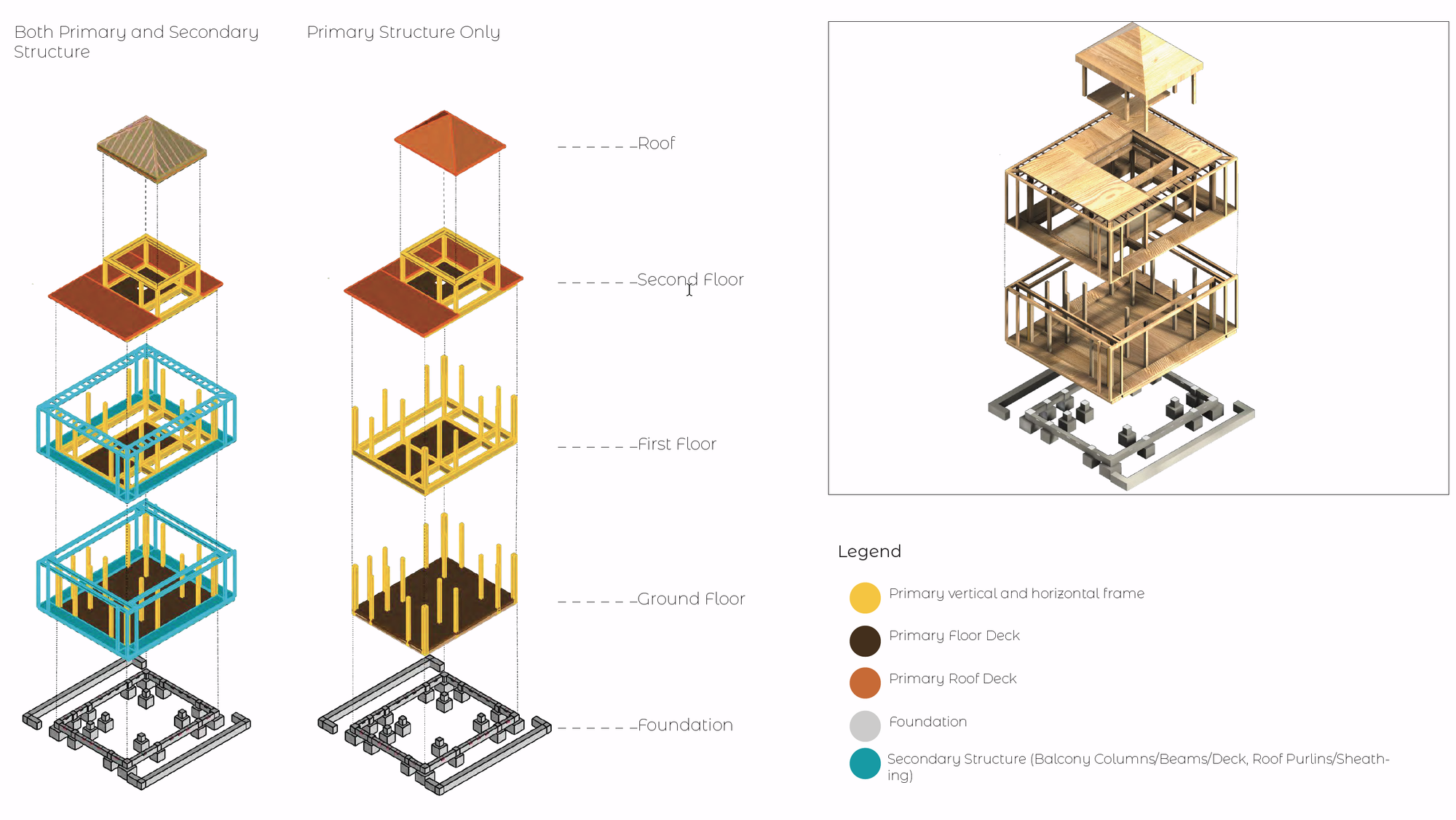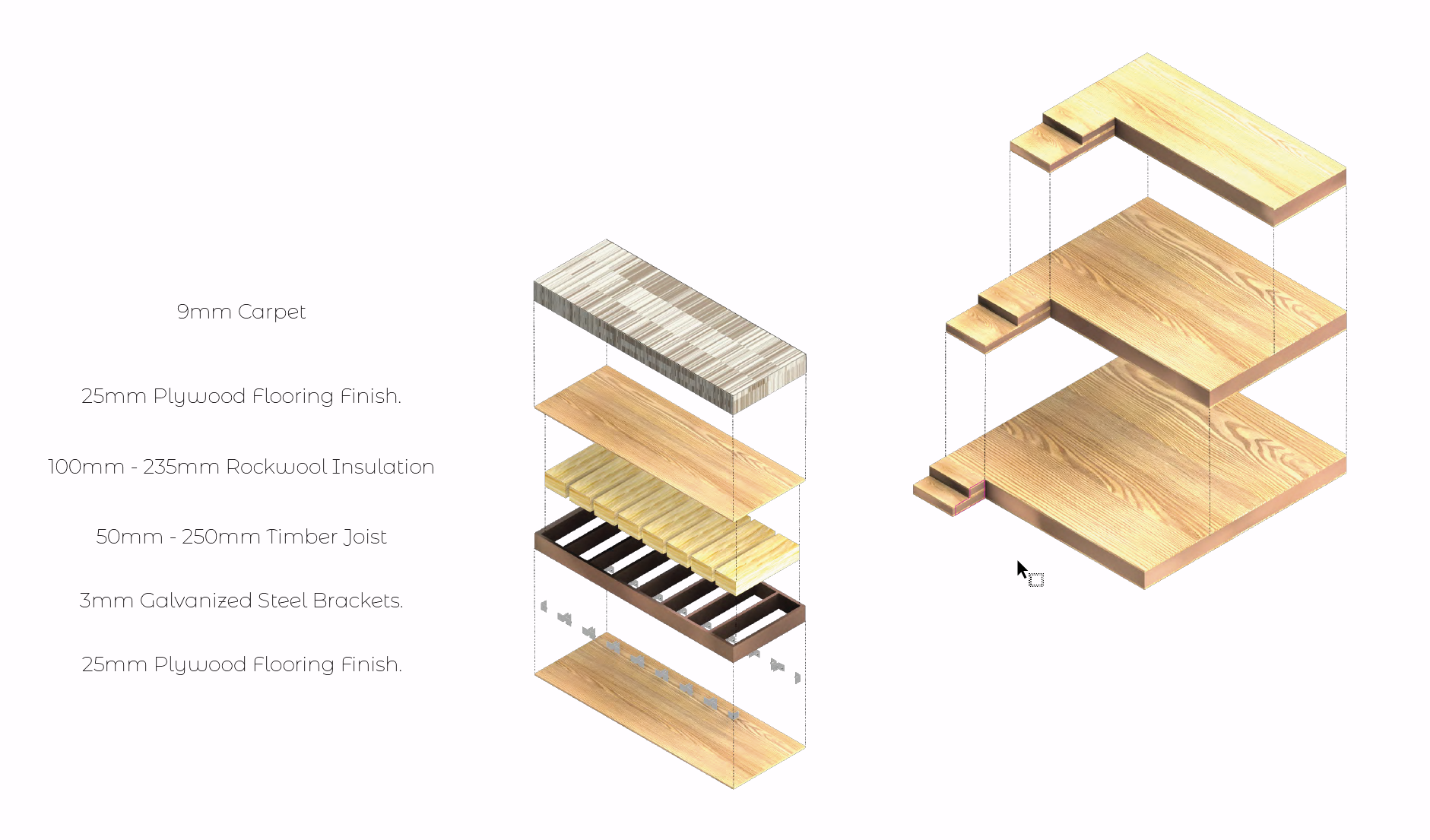 ဘယ်မှညာသို့၊ 3D primary နှင့် secondary structural model၊ အသေးစိတ် ပစ္စည်းတည်ဆောက်ပုံ နှင့် acoustic flooring တည်ဆောက်ပုံ diagram။