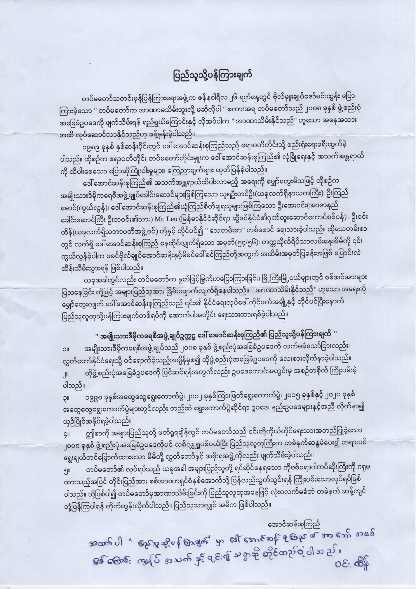 သို့သော် ထိုစာမှာတင် စစ်တပ်ဘက်ကရေးသလား အမေစုကိုယ်တိုင်စာစီခဲ့သလား မသဲကွဲခဲ့ပေ။